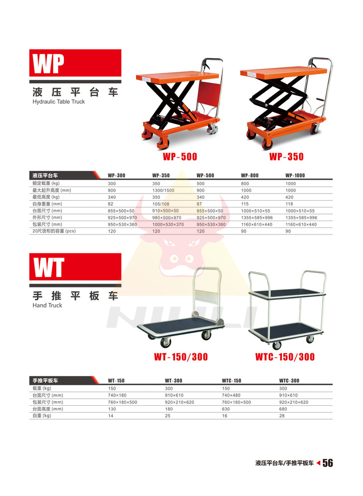 WP液壓平臺車采用高強度鋼材制作而成,設計結構合理,安全平穩可靠,內裝安全閥,全密封油缸,手動控制液壓系統升降,操作方便簡捷。 配有導向輪向輪節省操作者的體力,并能保護載重輪與托盤載重輪。