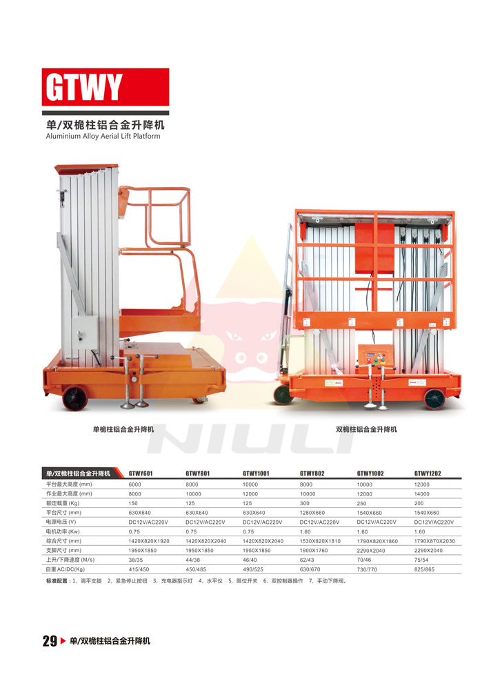 | 單桅柱鋁合金升降機 | GTWY601 | GTWY801 | GTWY1001 |
