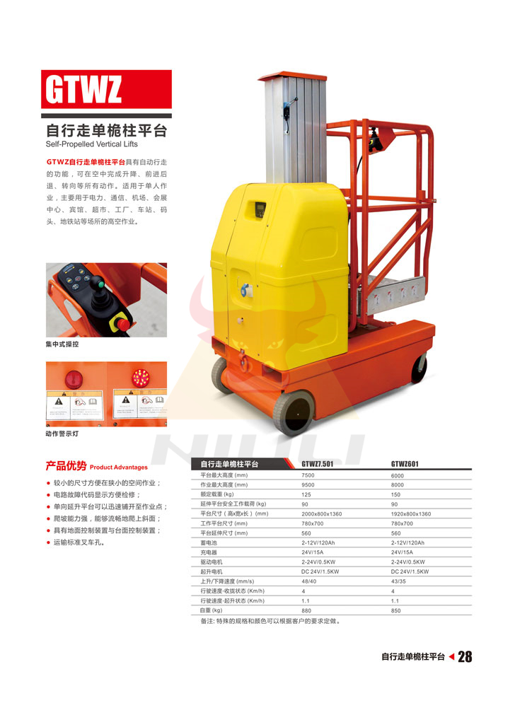具有自動行走的功能,可在空中完成升降、前進后退、轉向等所有動作。適用于單人作業,主要用于電力、通信、機場、會展中心、賓館、超市、工廠、車站、碼頭、地鐵站等場所的高空作業。