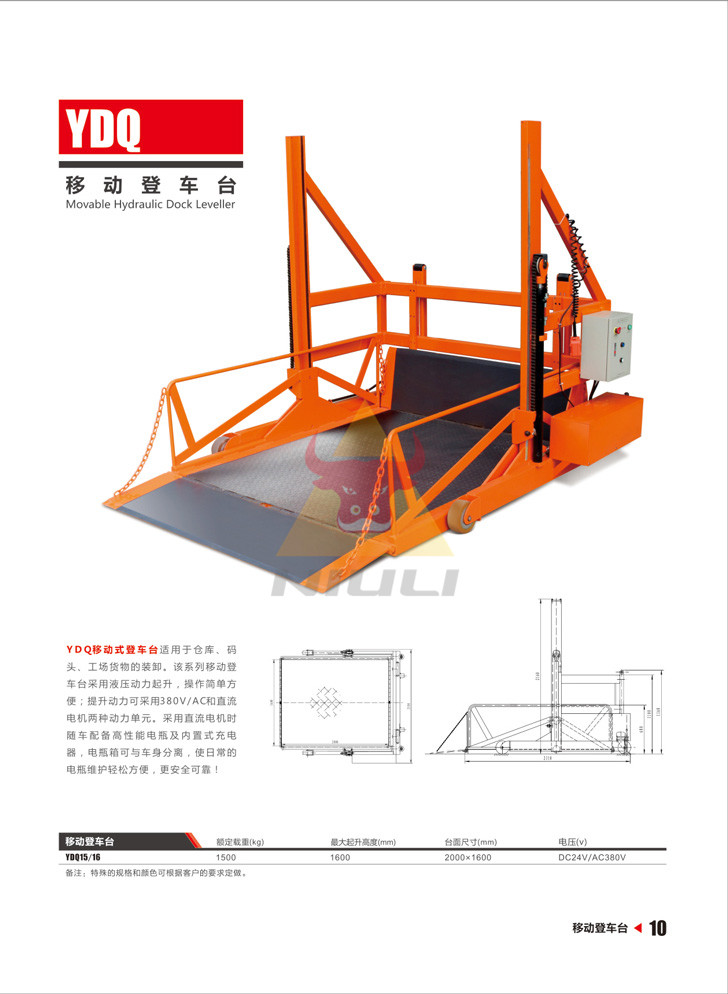 YDQ移動(dòng)式登車臺(tái)適用于倉庫、碼頭、工場貨物的裝卸。該系列移動(dòng)登車臺(tái)采用液壓動(dòng)力起升,操作簡單方便;提升動(dòng)力可采用380V/AC和直流電機(jī)兩種動(dòng)力單元。采用直流電機(jī)時(shí)隨車配備高性能電瓶及內(nèi)置式充電器。